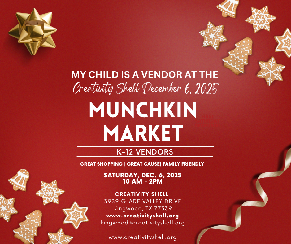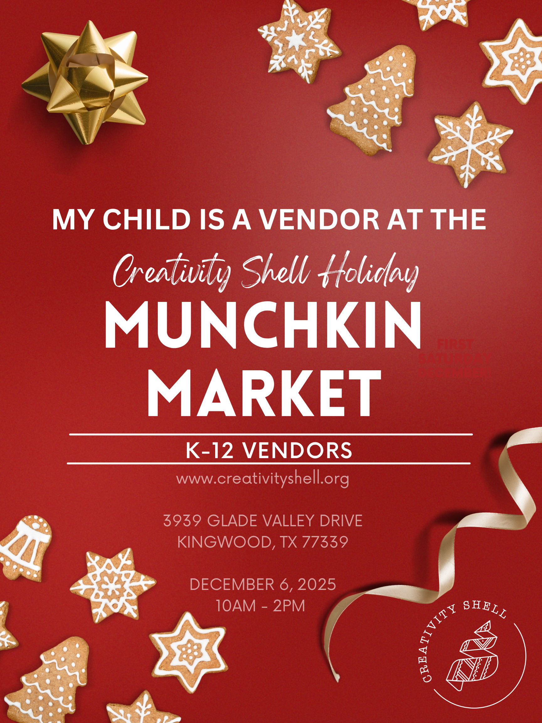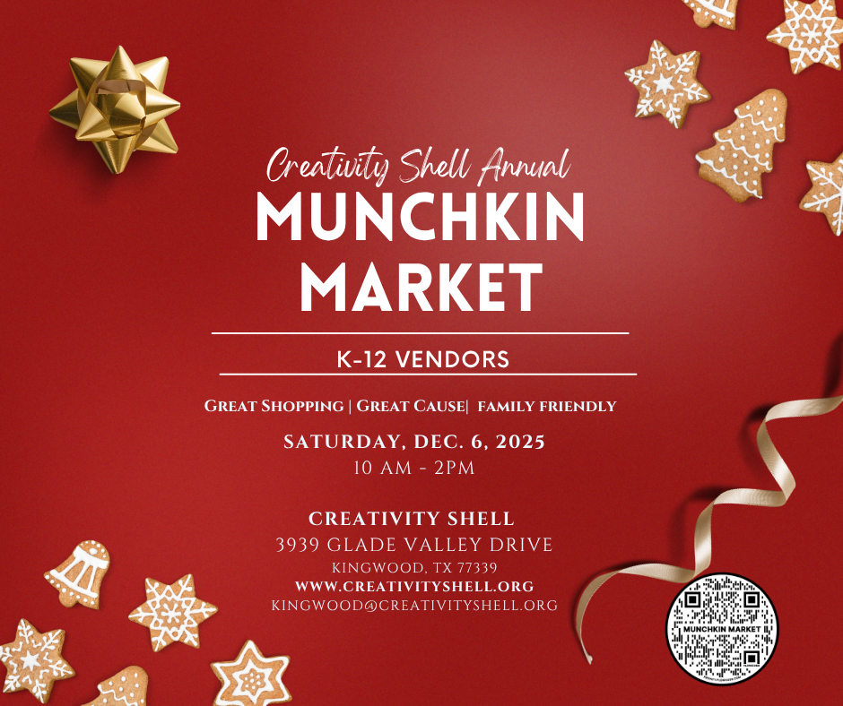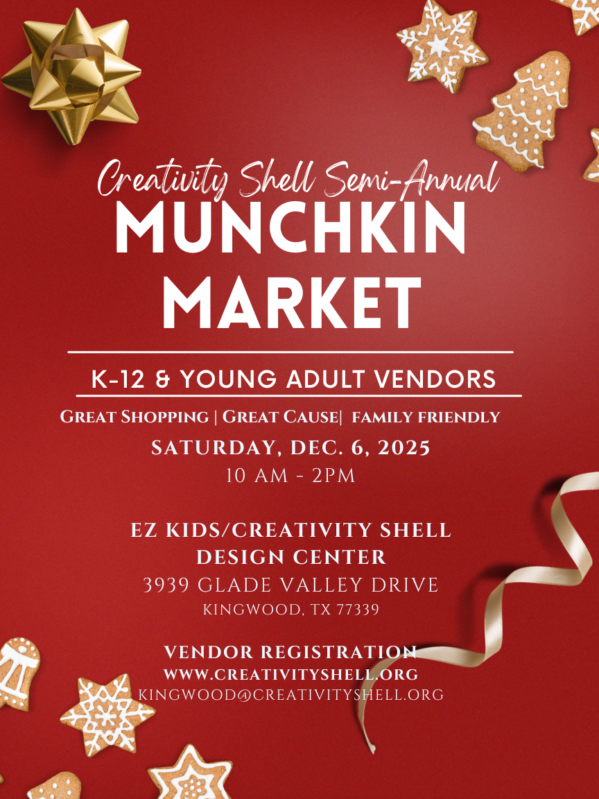 Kingwood, TX – The Creativity Shell is excited to announce its 2025 Munchkin Market, a youth entrepreneurship and makers’ market taking place on Saturday, December 6, 2025, from 10:00 AM – 2:00 PM at 3939 Glade Valley Drive, Kingwood, TX 77339.