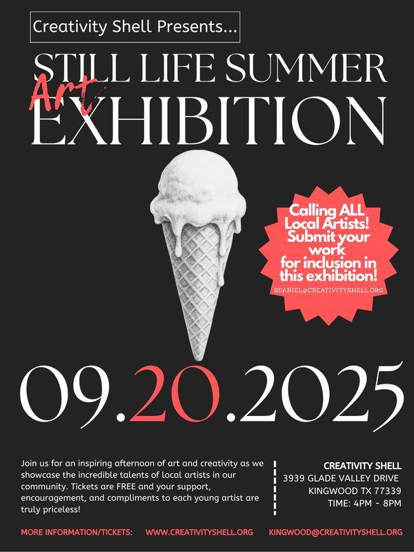 Join us for a special Still Life Summer Art Exhibition at the Creativity Shell on September 20, 2025, featuring a vibrant showcase of still life drawings, paintings, photography, sculptures, and more by talented local youth artists!